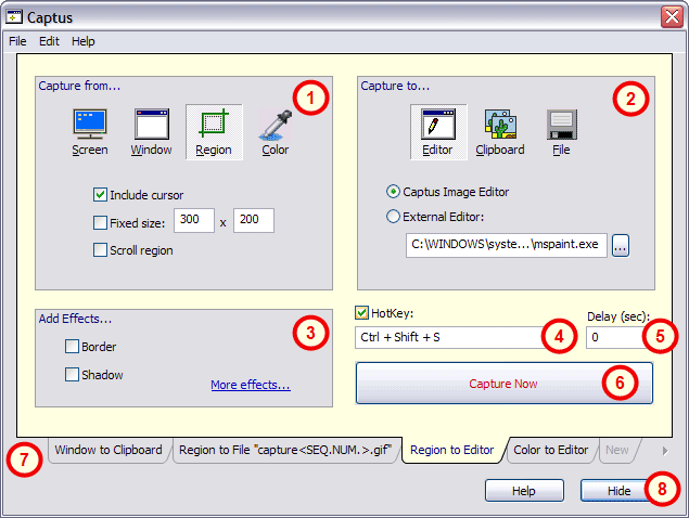 | Tabs along the bottom of the window represent different capture scenarios. Edit, Add New or change HotKey to customize Captus for your own needs. |